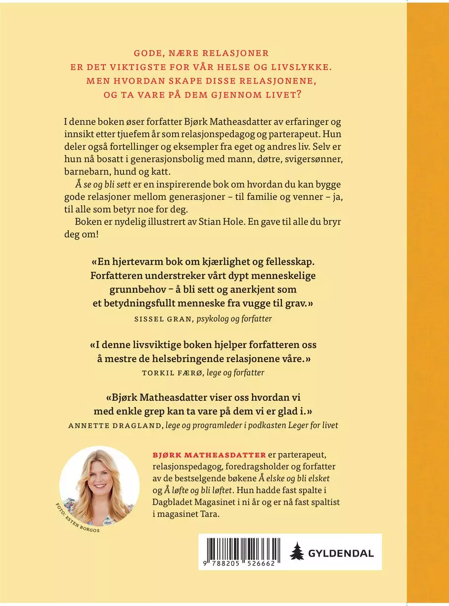 «En bok i humanismens tegn! Bjørk Matheasdatter har skrevet nok en hjertevarm bok om kjærlighet og fellesskap, men flergenerasjonsaspektet er i mine øyne noe av det viktigste hun løfter frem her. Hun forlater riktignok aldri parforholdet som pilaren i en familie, men nå har hun jammen gitt oss en lærebok i kjærlig generasjonsbygging. Kanskje er dette noe av det viktigste en skrivende terapeut kan gjøre i et samfunn der alderssegregering truer og samholdet på tvers av aldersgrupper utfordres. Bjørk viser oss nødvendigheten av å bygge bro mellom de små og de store, mellom de unge og de gamle. Slik understreker forfatteren vårt dypt menneskelige grunnbehov – å bli sett og anerkjent som et betydningsfullt menneske fra vugge til grav.»