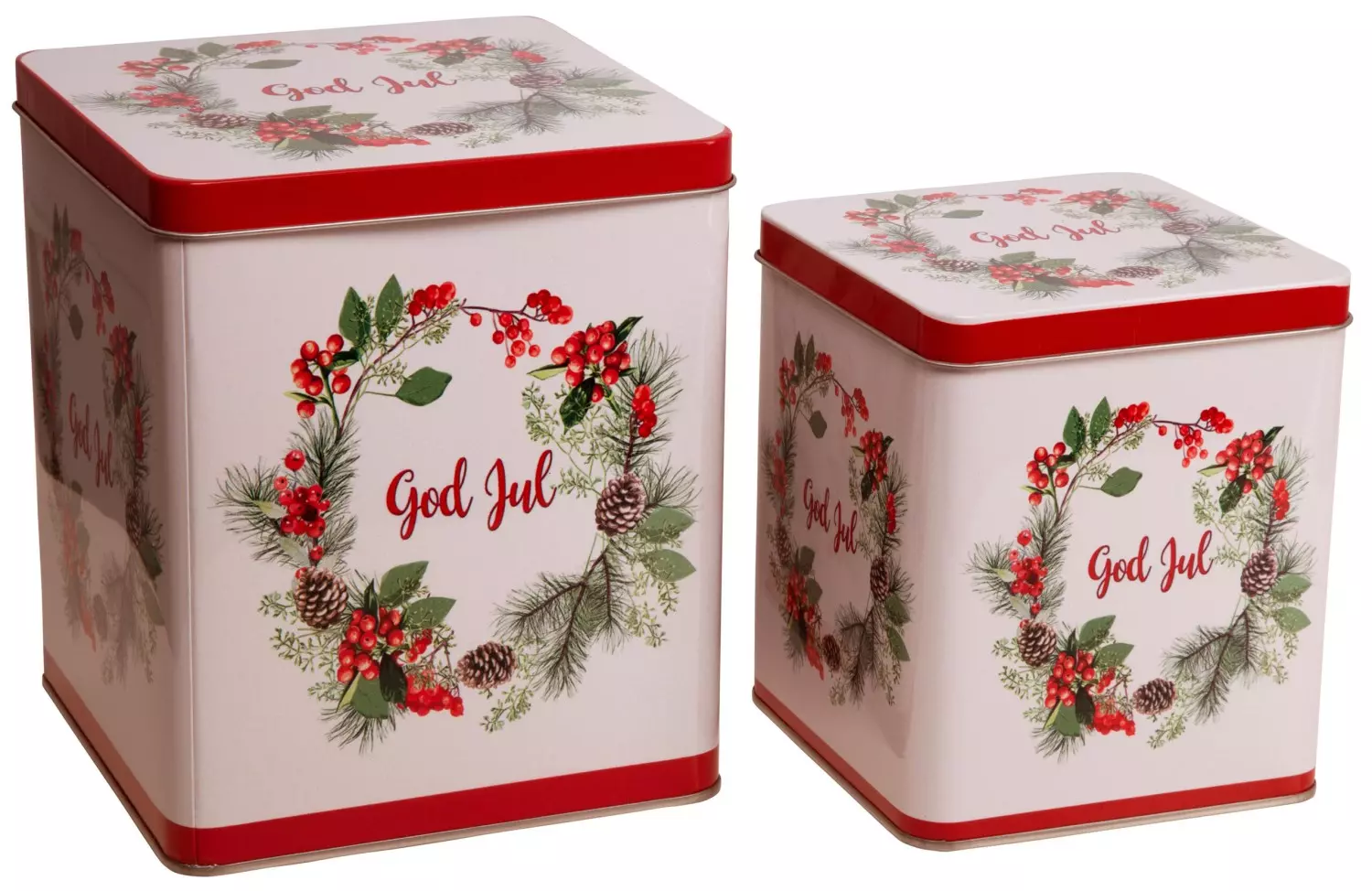 Boks metall, Krans God Jul, Sett m/2 stk: 12x12x14 cm + 15,5×15,5×18 cm