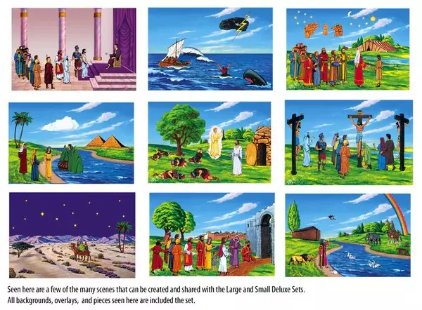 Flanellograf, Liten (40×60 cm), Bibelhistorien 3-årssett, 3 bakgr. + 4 overlegg, MONTERT (må klippes