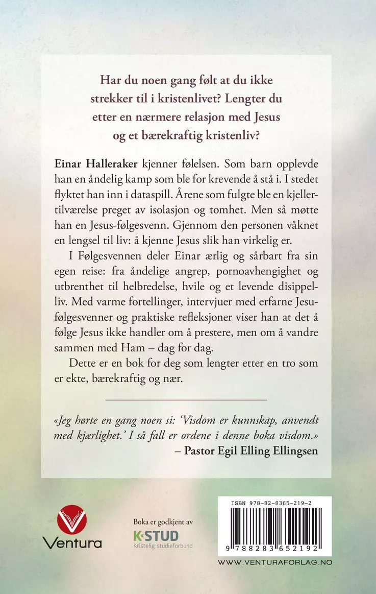 I Følgesvennen deler Einar ærlig og sårbart fra sin egen reise: fra åndelige angrep, pornoavhengighet og utbrenthet til helbredelse, hvile og et levende disippelliv. Med varme fortellinger, intervjuer med erfarne Jesu-følgesvenner og praktiske refleksjoner viser han at det å følge Jesus ikke handler om å prestere, men om å vandre sammen med Ham – dag for dag.