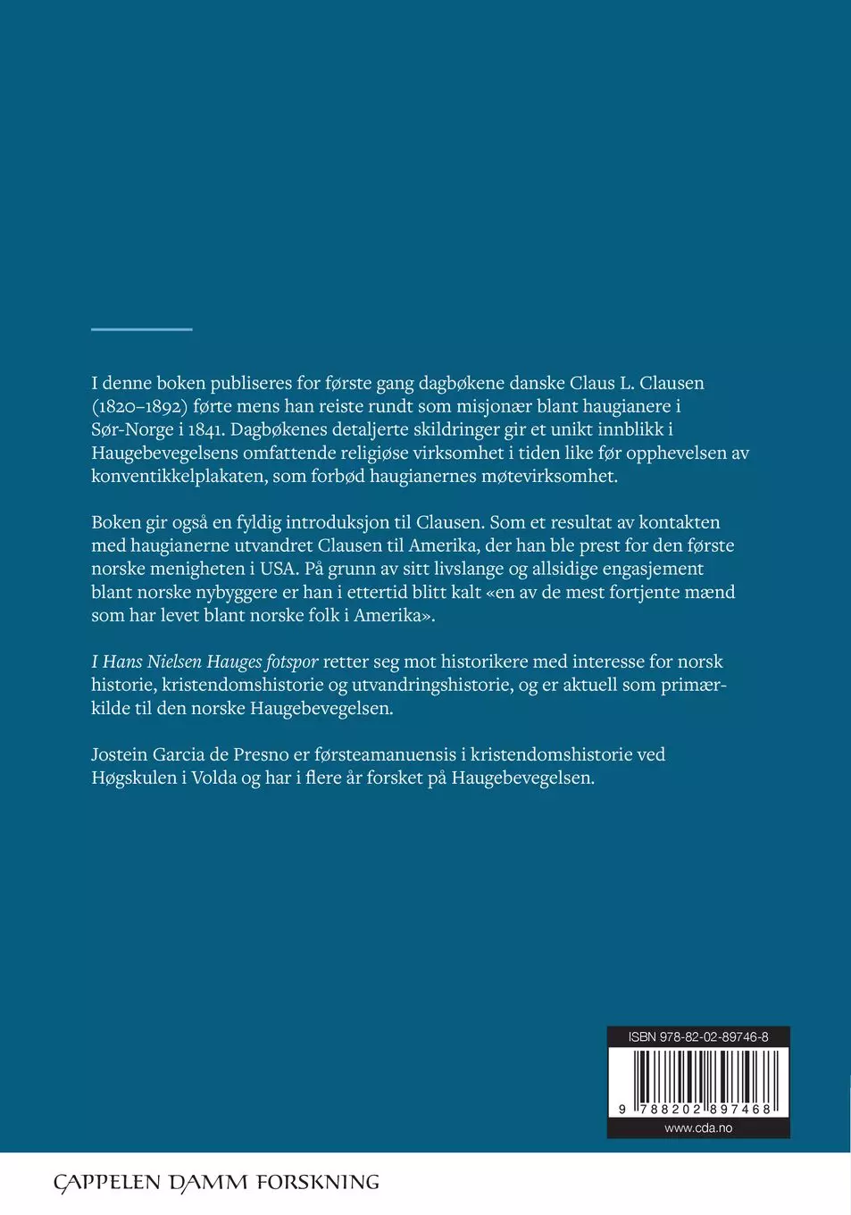Boken gir også en fyldig introduksjon til Clausen. Som et resultat av kontakten med haugianerne utvandret Clausen til Amerika, der han ble prest for den første norske menigheten i USA. På grunn av sitt livslange og allsidige engasjement blant norske nybyggere er han i ettertid blitt kalt «en av de mest fortjente mænd som har levet blant norske folk i Amerika».