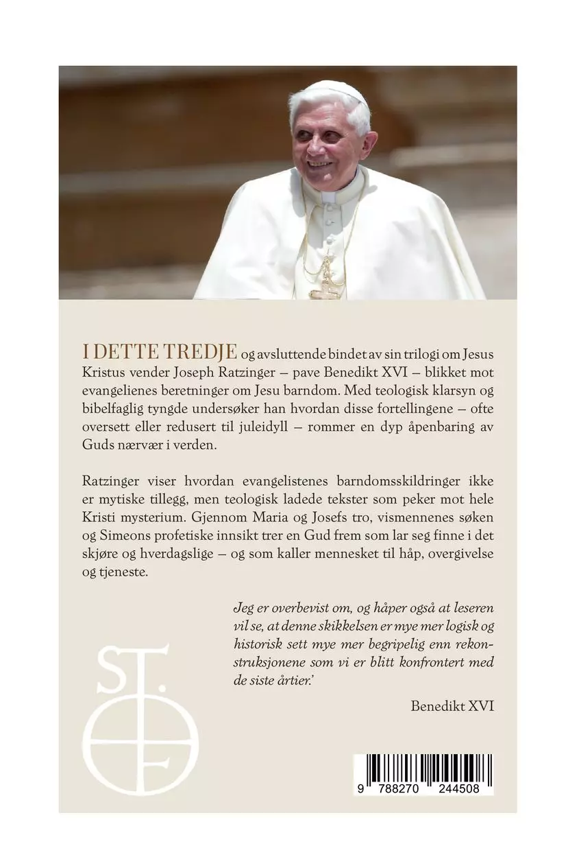 I dette tredje og avsluttende bindet av sin trilogi om Jesus Kristus vender Joseph Ratzinger – pave Benedikt XVI – blikket mot evangelienes beretninger om Jesu barndom. Med teologisk klarsyn og bibelfaglig tyngde undersøker han hvordan disse fortellingene – ofte oversett eller redusert til juleidyll – rommer en dyp åpenbaring av Guds nærvær i verden.