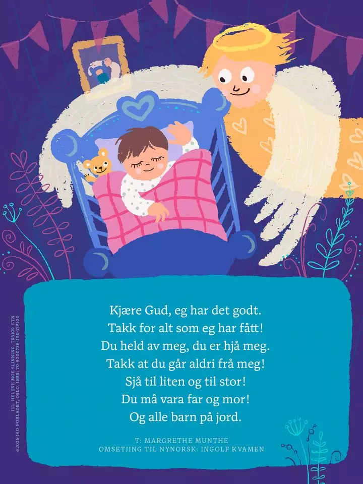 Bilde i stiv papp med to kveldsbøner. Ein song på kvar side. Same illustrasjon på begge sidene. Format: 180×240 mm.