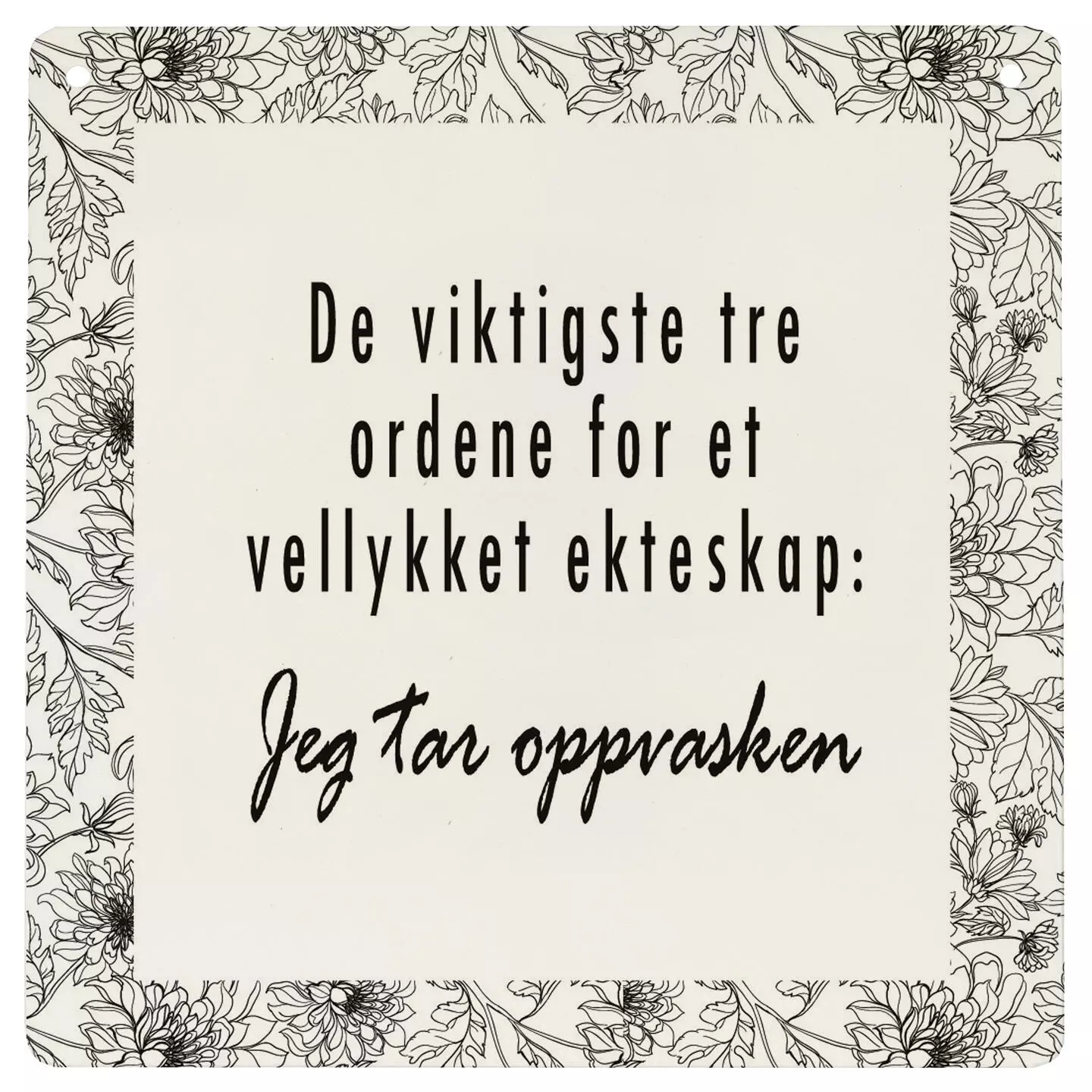 Metallskilt, kvadratisk, Tre ord om oppvask, 15,5×15,5 cm