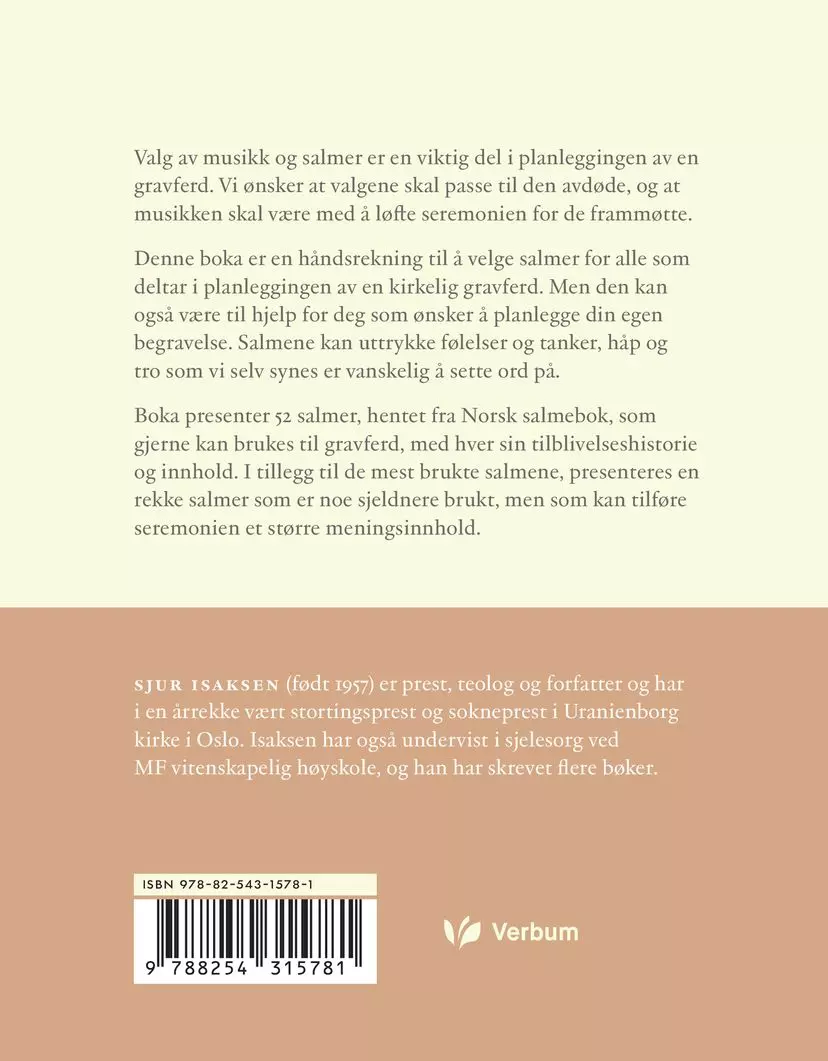 Denne boka er en håndsrekning til å velge salmer for alle som deltar i planleggingen av en kirkelig gravferd. Men den kan også være til hjelp for deg som ønsker å planlegge din egen begravelse. Salmene kan uttrykke følelser og tanker, håp og tro som vi selv synes er vanskelig å sette ord på.